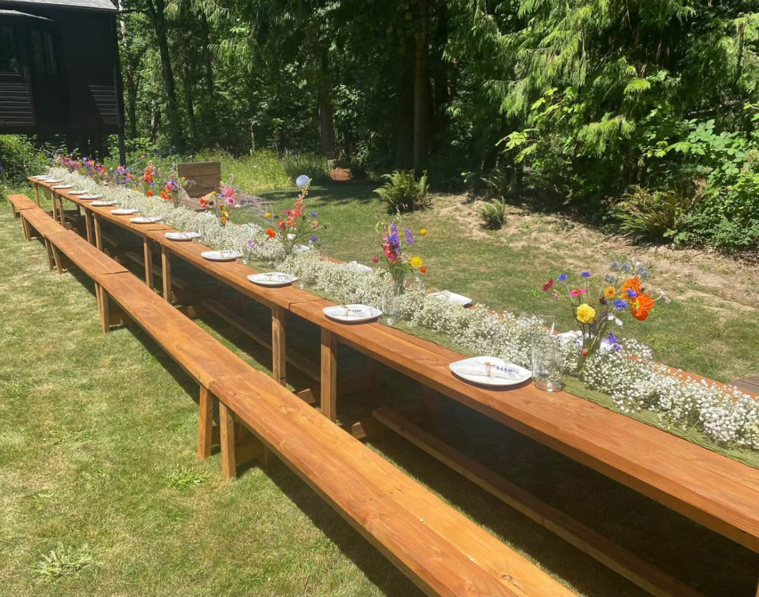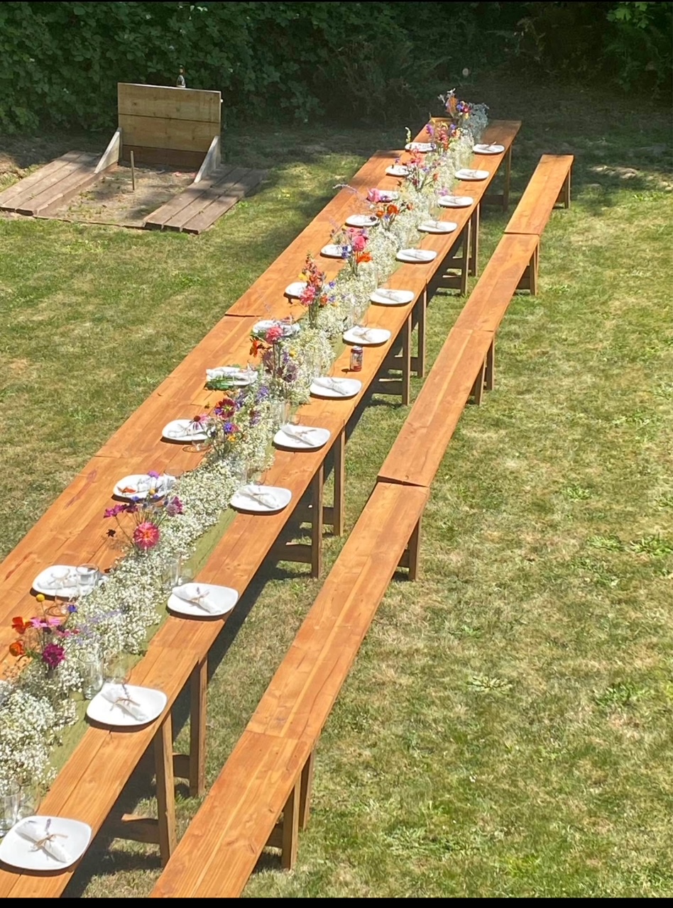 Family Farm Table and 2 benches ( 30” x 8 foot ) seat 8 people per set.